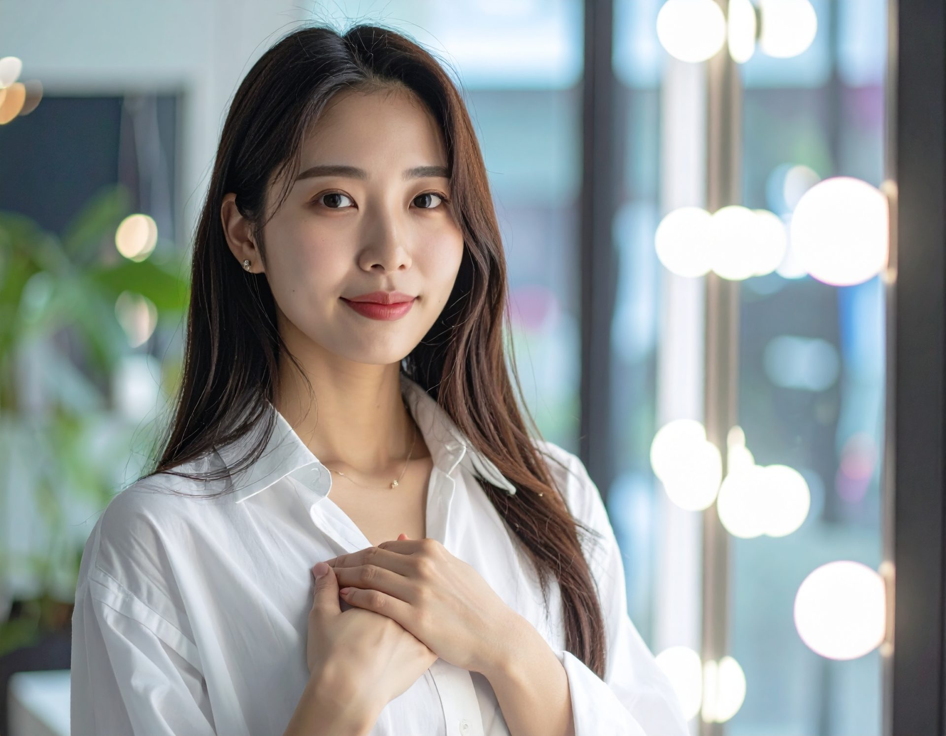 Firefly__胸に手を当てて安心している、白シャツ、20代日本人女性、艶のあるストレートの横髪、背景は光の差し込む美容室の窓際 650178