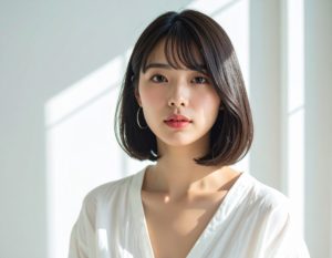Firefly_30代の日本人女性、丸顔、正面向き、サラサラのストレートヘア、耳掛けショートボブ、内巻きでまとまっている、清潔感のあるナチュラルな表情、美容-3