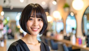 Firefly_20代の日本人女性、艶のある綺麗な黒髪ショートヘア、美容室の室内を背景、ポップな雰囲気 11209